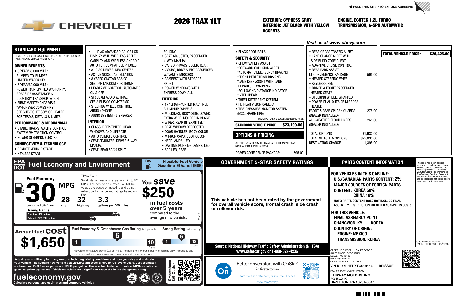 Meet the eye-catching 2026 Chevrolet Trax LT — a compact SUV in sleek Gray with a bold Yellow interior that turns heads while staying perfectly practical. Enjoy confident, composed driving thanks to 4-wheel ABS, rack-and-pinion steering, independent suspension and 225/60R17 tires, plus standard driver and passenger airbags for everyday peace of mind. Despite its compact 178.6" length and nimble 7.3" ground clearance, the Trax delivers roomy comfort — front legroom 41.9" and seating for five — and comes backed by Chevrolet’s warranties (36/36K basic, 60/60K powertrain, 72/100K rust). Ready for city streets and weekend plans — stop in today and take this Trax LT for a test drive.