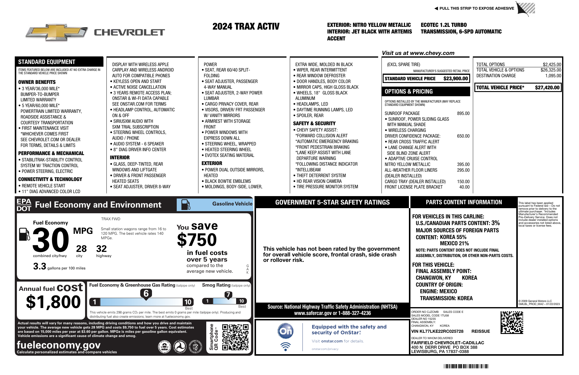 Turn heads in the 2024 Chevrolet Trax Activ FWD — striking Yellow exterior paired with a sleek Black leather interior. Enjoy daily comfort and convenience with heated leather front seats, power-adjustable driver and passenger seats with lumbar support, a heated leather-wrapped steering wheel, and easy keyless entry with remote start and climate control. Rock your commute with a premium sound system featuring a subwoofer, 18-inch wheels and a full-size spare, while advanced safety tech — ABS, electronic brake assist, traction and stability control plus a full complement of airbags and child-safety locks — keeps you protected. Backed by Chevy’s 3‑year/36k basic and 5‑year/60k powertrain warranties. Ready for a test drive? Stop by today and let me show you everything this Trax can do.