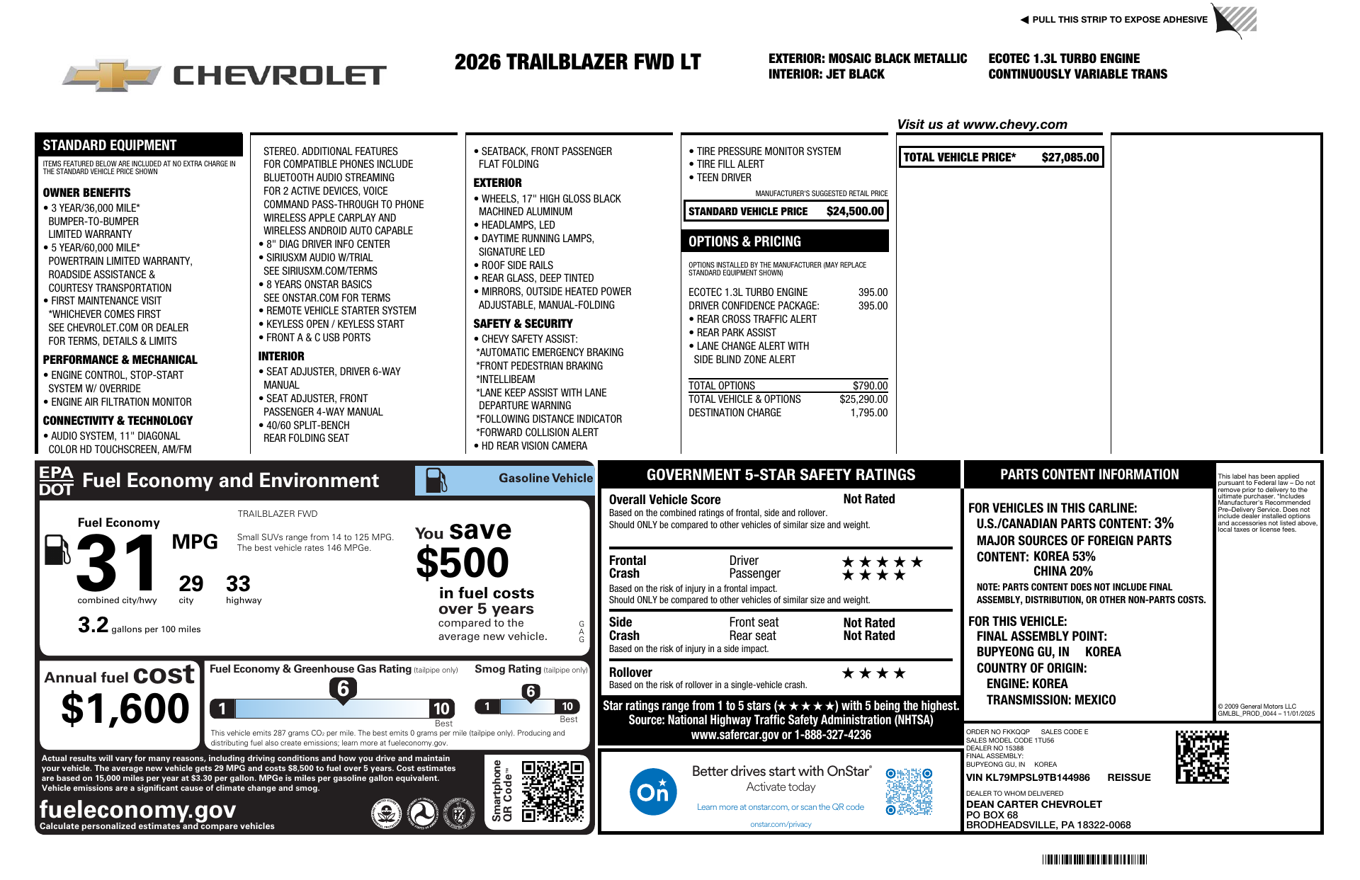 Meet the 2026 Chevrolet Trail Blazer LT in striking Black with a sleek Black interior — a compact SUV that blends city-smart styling with real capability. Equipped with standard AWD, ABS, traction and stability control, and a full suite of airbags, it’s engineered for confident, secure driving. Enjoy comfort and convenience with heated front seats, a power sunroof, keyless entry and remote start with climate control, plus navigation and AM/FM for every drive. Roomy enough for five, backed by GM’s strong warranties (3 years/36K basic, 5 years/60K powertrain, 6 years/72 months rust), this Trail Blazer is ready to elevate your daily commute — stop by for a test drive today.