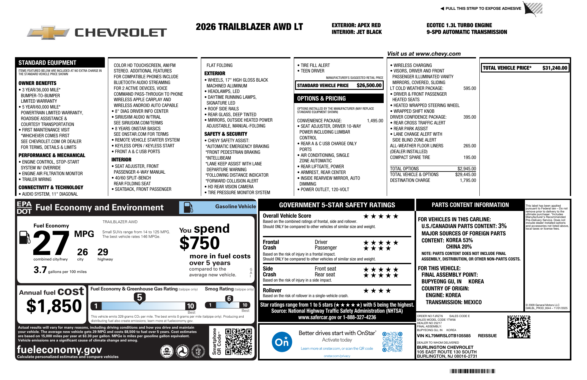 Turn heads in the 2026 Chevrolet Trail Blazer LT — bold Red exterior with a refined Black interior. This compact SUV pairs city-smart style with real capability: standard AWD, ABS, traction and stability control, plus a limited-slip differential for confident handling. Enjoy comfort and convenience with heated front seats, a power sunroof, dual-zone climate, navigation, keyless entry and remote start with climate control. Top-tier safety comes standard — multiple airbags, child door locks and vehicle anti-theft — and Chevrolet backs it with strong warranties (3/36 basic, 5/60 powertrain, 6/100 rust). Ready to take it for a spin?