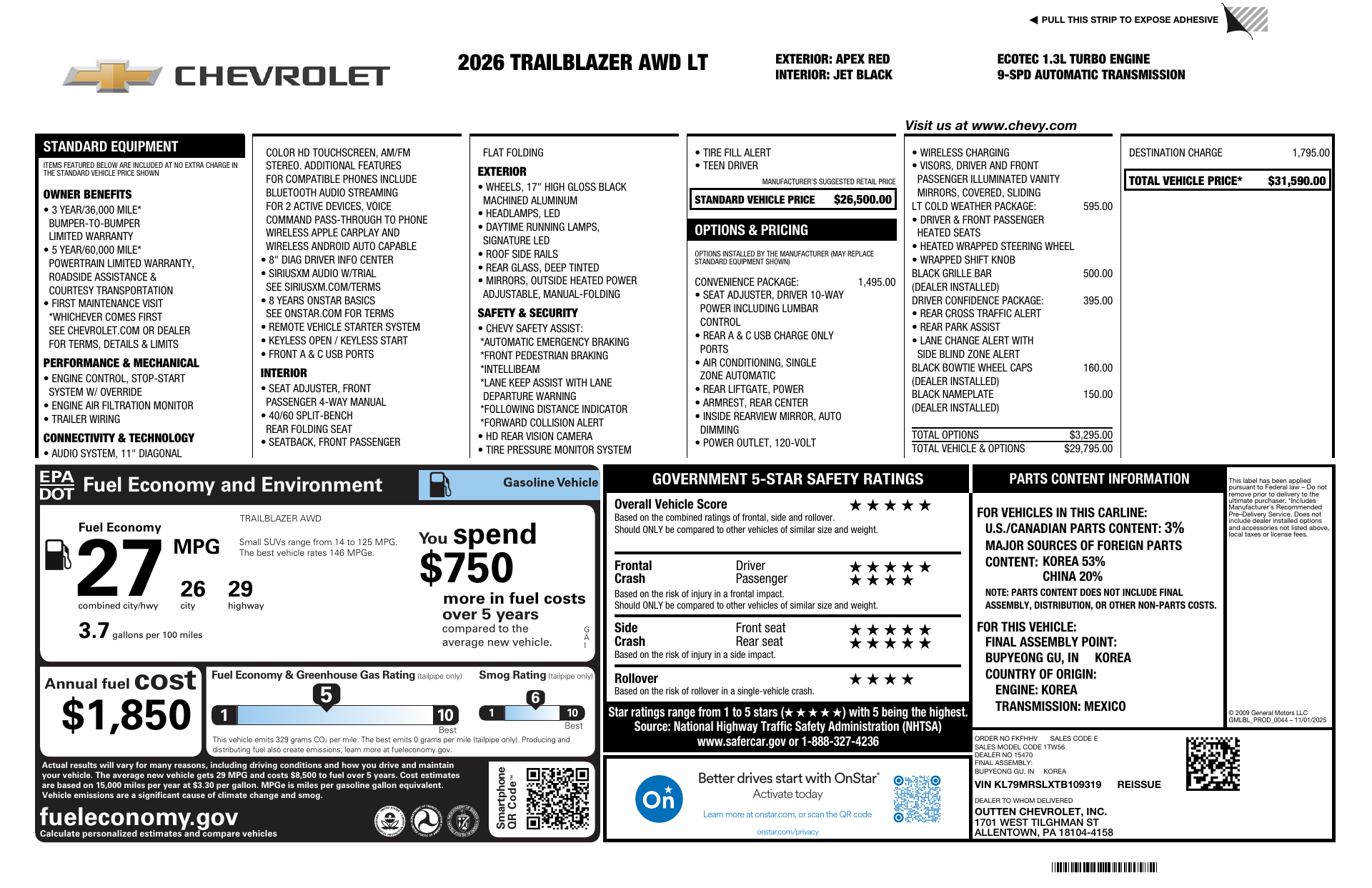 Seats five comfortably and comes backed by generous coverage — 3 years/36K basic, 5 years/60K powertrain, and 6 years/100K rust. Want to see it shine in person? Come take the red Trailblazer LT for a test drive today.