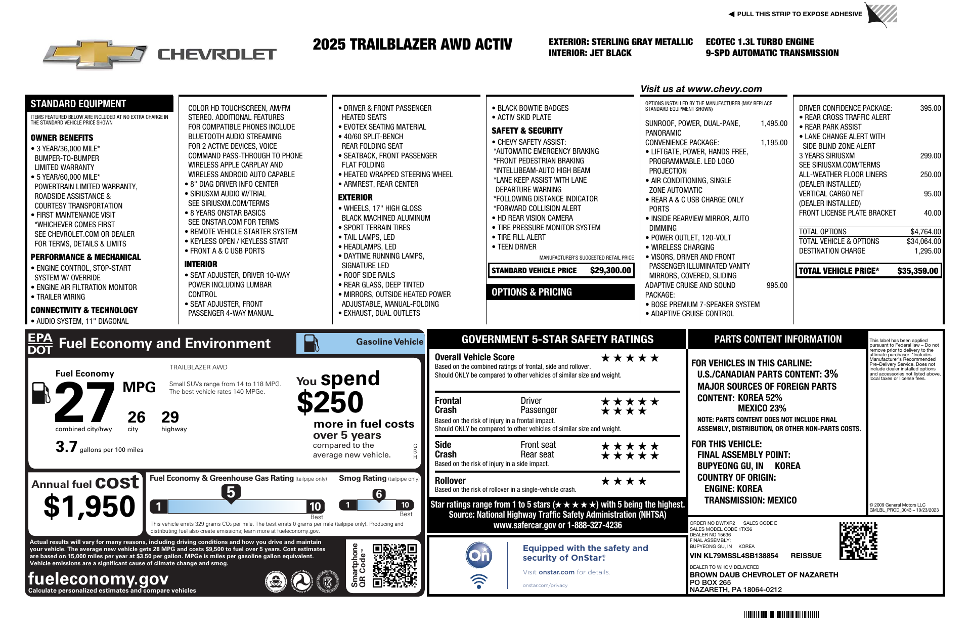 Turn heads in the 2025 Chevrolet Trail Blazer Activ — a bold Gray exterior paired with a striking Yellow interior that blends style and personality. Built for confident driving, it comes standard with AWD, a power sunroof, alloy wheels, automatic headlights and keyless entry with remote ignition and climate control. Enjoy comfort-focused touches like heated front seats, a heated leather-wrapped steering wheel, navigation and driver-adjustable power seating, plus advanced safety systems including ABS, traction/stability control and a full complement of airbags. Backed by Chevy factory coverage (36 months/36,000 mi basic, 60 months/60,000 mi powertrain, 72 months/100,000 mi rust). Ready for a test drive?