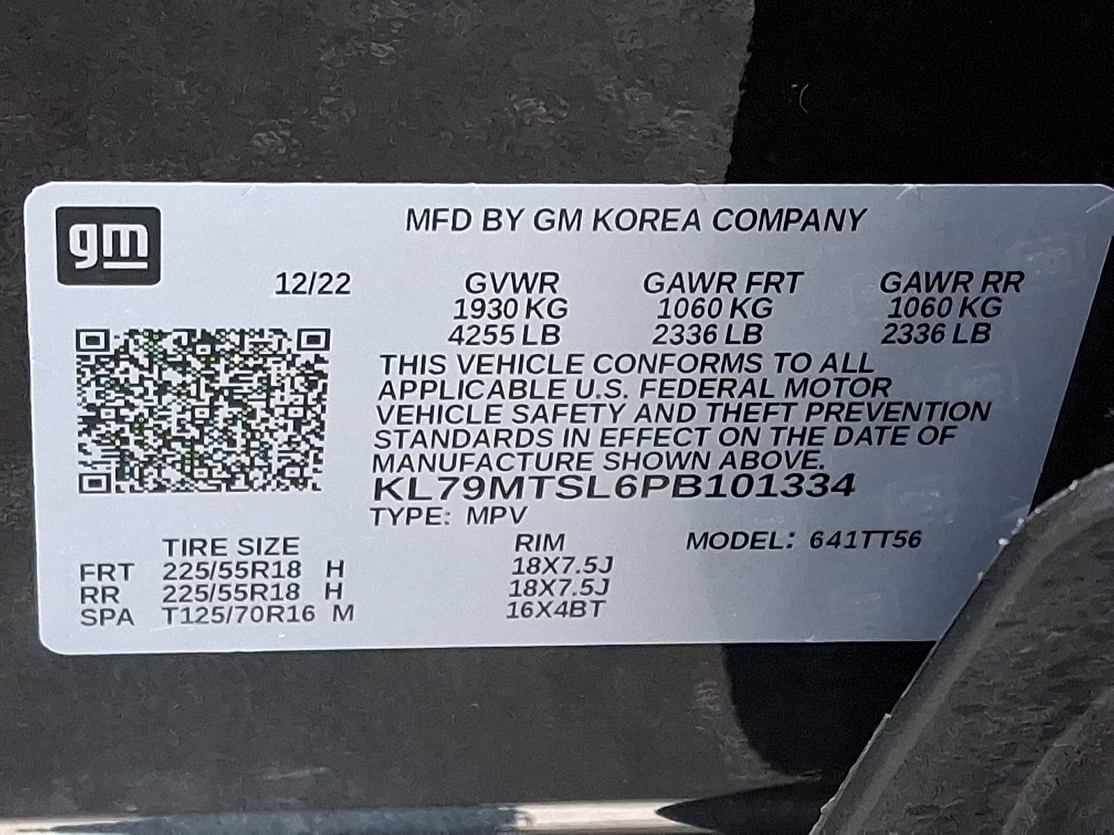 VIN: KL79MTSL6PB101334