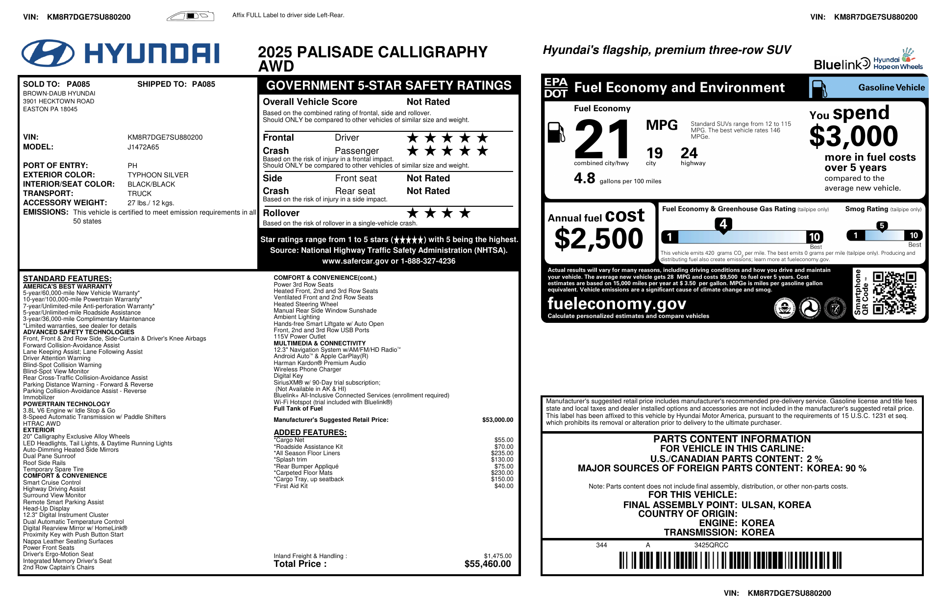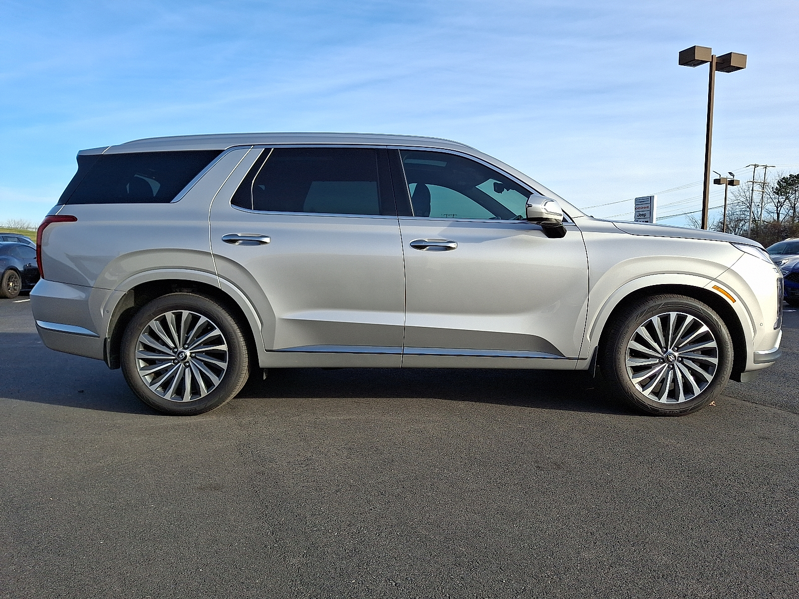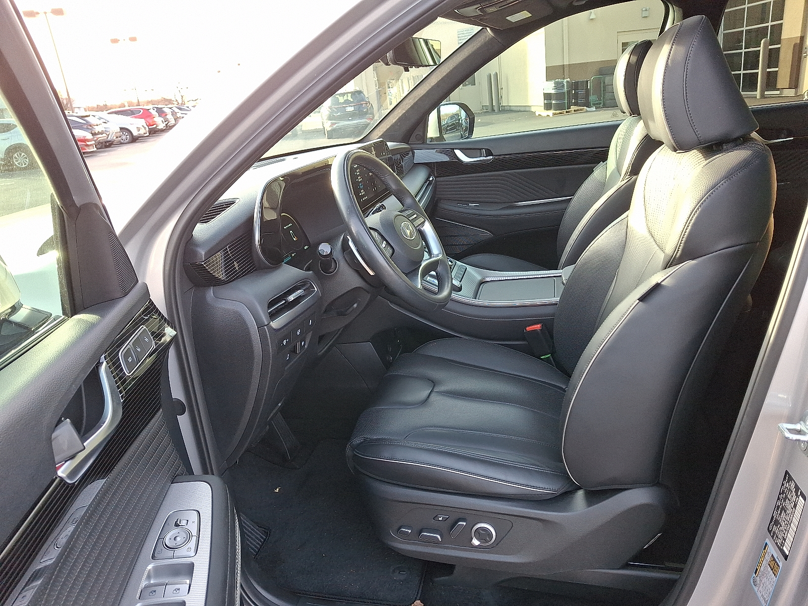 Introducing the 2025 Hyundai Palisade Calligraphy in sleek Silver with a refined Black leather interior — where premium comfort meets family-ready capability. Enjoy heated and ventilated front seats, a heated leather steering wheel, intuitive navigation and keyless entry with remote start/climate control for effortless convenience. Confident on any road with standard AWD, traction/vehicle stability control, ABS and a full suite of airbags and safety systems, plus a power sunroof, 20-inch alloy wheels and roomy 7-passenger seating. Backed by Hyundai’s strong coverage — 5 years/60,000-mile basic and 10 years/100,000-mile powertrain warranties — this Palisade Calligraphy is luxury, safety and value in one stylish package. Stop by today and take it for a test drive.