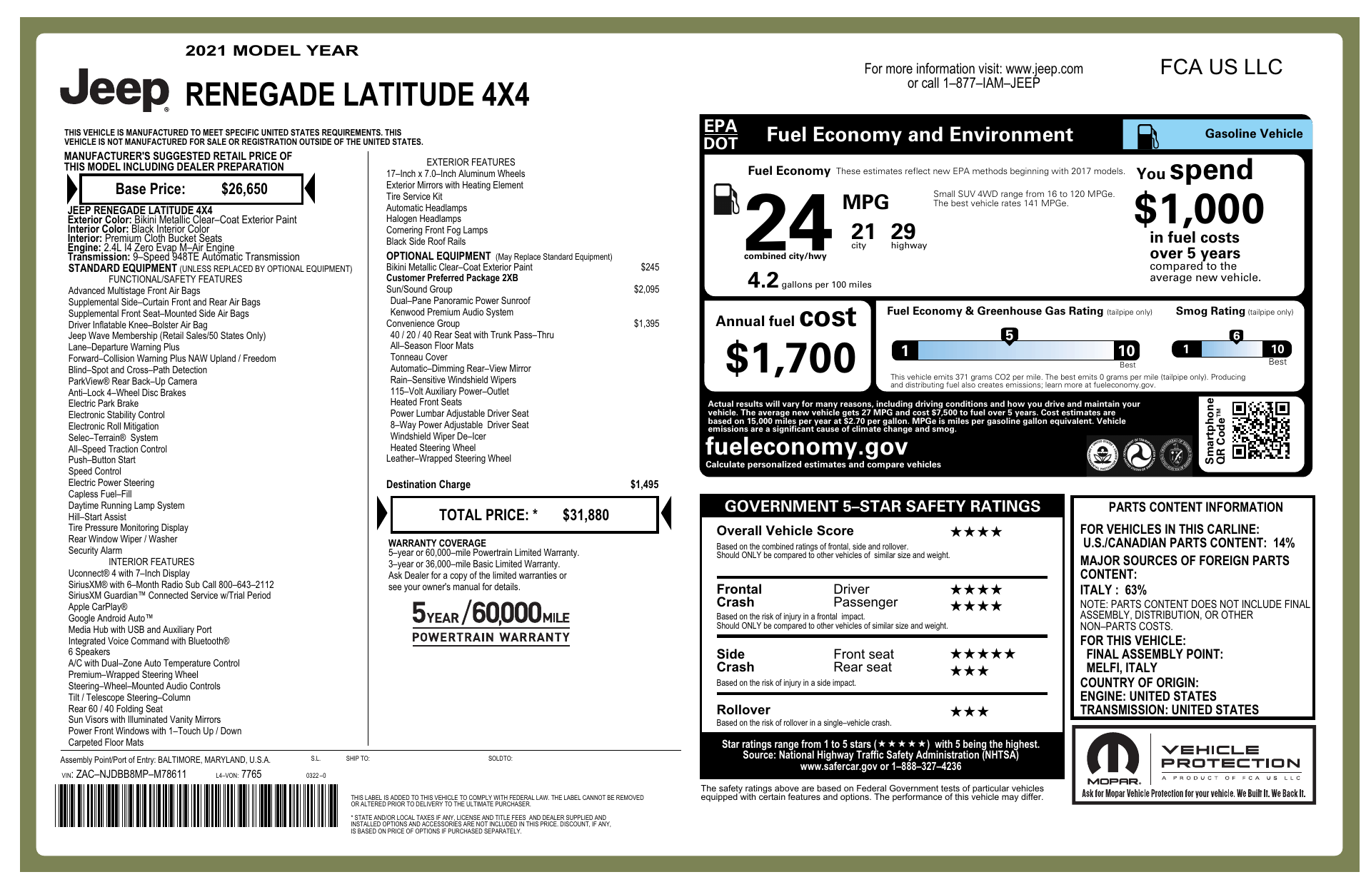 Sleek, confident and built to go anywhere — the 2021 Jeep Renegade Latitude in black-on-black blends rugged capability with city-smart sizing. - Safety & security: comprehensive safety suite with multiple airbags, ABS/4‑wheel ABS, traction control, vehicle anti-theft and child safety door locks for peace of mind. - Comfort & convenience: roomy five‑seat cabin, cruise control, telescopic steering column and power windows make every drive effortless. - Confident handling: independent suspension front and rear, rack-&-pinion steering, 215/60R17 tires and fog lights deliver a composed, surefooted ride — plus a solid factory warranty (36/36 basic, 60/60 powertrain, 60 months rust). Black looks. Big capability. Ready when you are — come in for a test drive today.