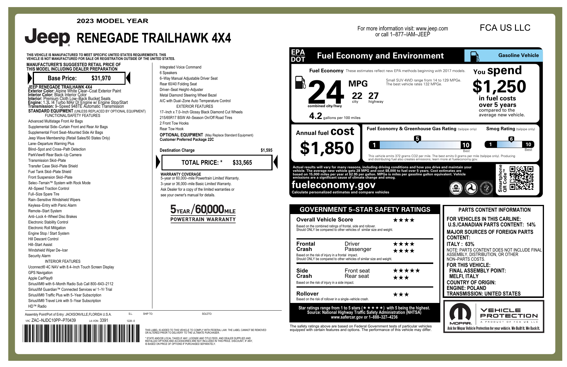 Meet the 2023 Jeep Renegade Trailhawk — Alpine White exterior, bold black leather interior. Built to go further with full-time 4WD, locking/limited‑slip differentials and 8.7" ground clearance, it’s Trailhawk‑ready for off‑road adventures. Inside, enjoy heated leather seats, heated leather steering wheel, power‑adjustable seats with lumbar support and convenient keyless entry plus remote start with climate control. Confident driving comes standard too: ABS, stability and traction control, a full complement of airbags, tire‑pressure monitoring and a premium sound system with subwoofer. Stop by today and take this capable, comfortable Trailhawk for a test drive — backed by a 3‑year/36K basic and 5‑year/60K powertrain warranty.